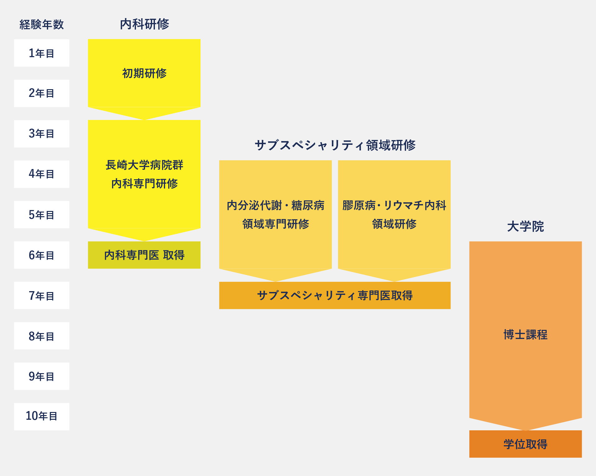 私たちの講座の最も大きな特徴は、“皆さんと一緒にキャリア・デザインを考えること”です。皆さんは内科領域とサブスペシャリティ領域の膠原病・リウマチ内科領域もしくは内分泌代謝・糖尿病内科領域の専門医をまずは目標にすると思います。内科領域は6年目に、サブスペシャリティ領域は7年目に専門医が取得できるようにプログラミングし、その後の指導医もスムーズに取れます。臨床の研鑽を積み、素晴らしい内科専門医、サブスペシャリティ専門医および指導医を目指して下さい。その頃になると、“より専門的な臨床経験を積みたい”、“より地域医療にコミットしたい”、“患者さんにフィードバックする研究をしたい”、“海外で研鑽したい”など、皆さんの将来設計が、より明確になっていると思います。どれも素晴らしいものです。私たちは皆さんのキャリア・デザインを強力にサポートし、皆さんの明るい“perspective”を保証します。